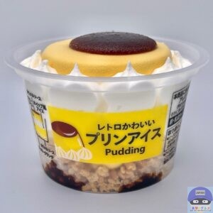 卵のコクが感じられるプリンアイスとほろ苦いカラメルの懐かしい味わいに、ホイップ風アイスとクッキークランチで食感の変化も楽しめる、レトロで可愛らしい見た目のカップアイスです。