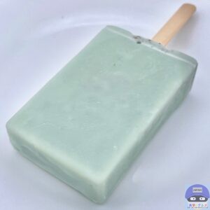 ミントアイスの中に、チョコチップ入りのミントかき氷を入れたアイスキャンディーです。