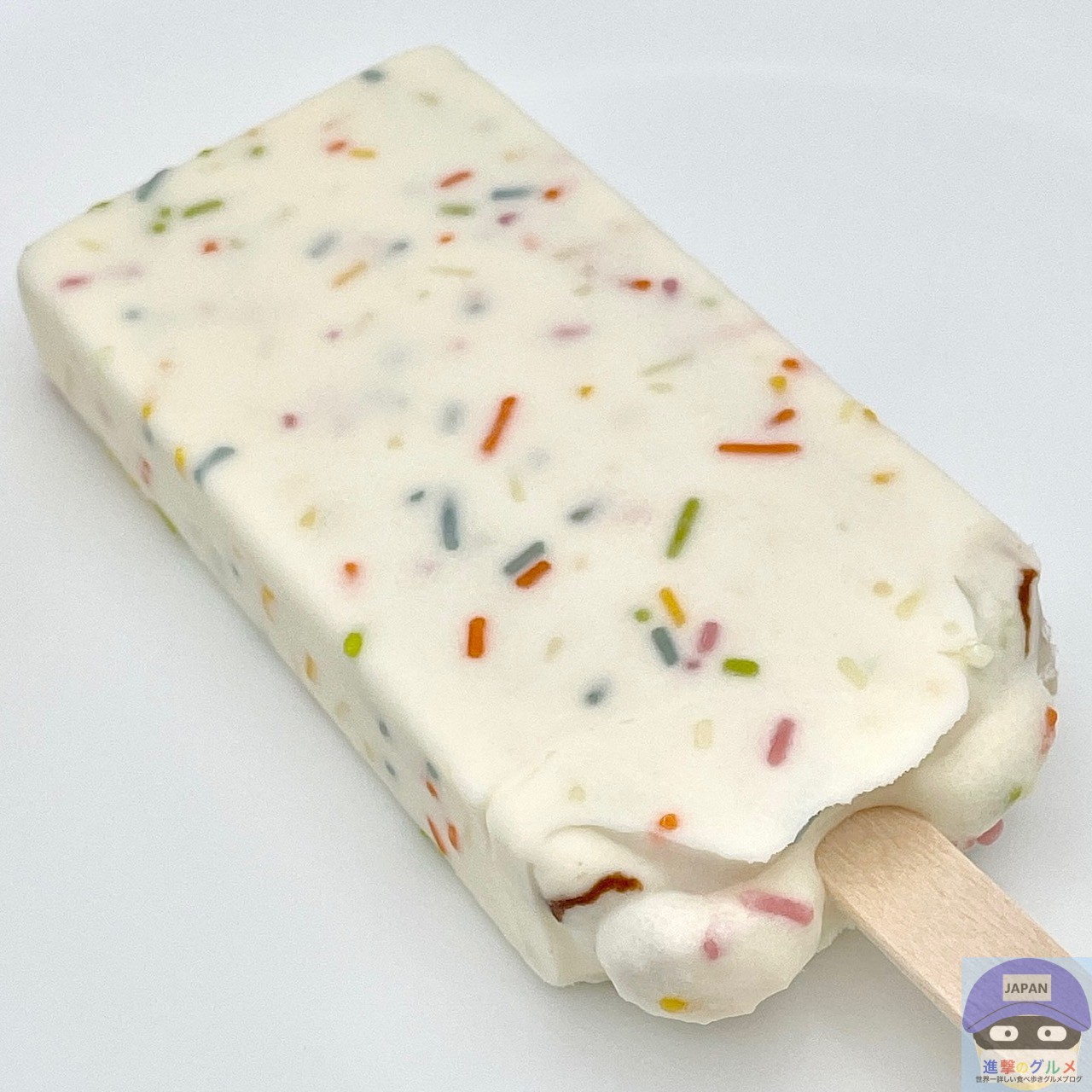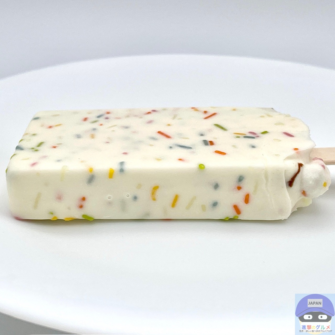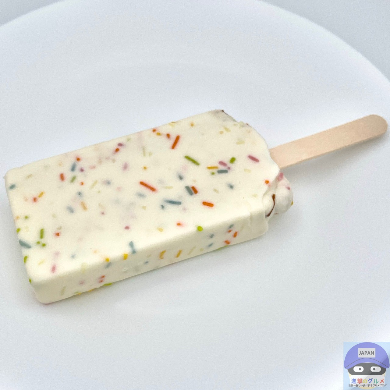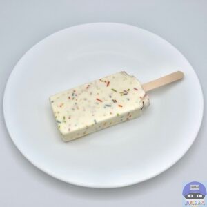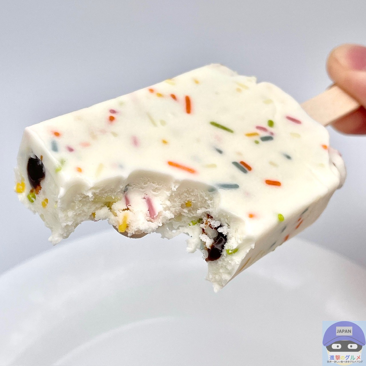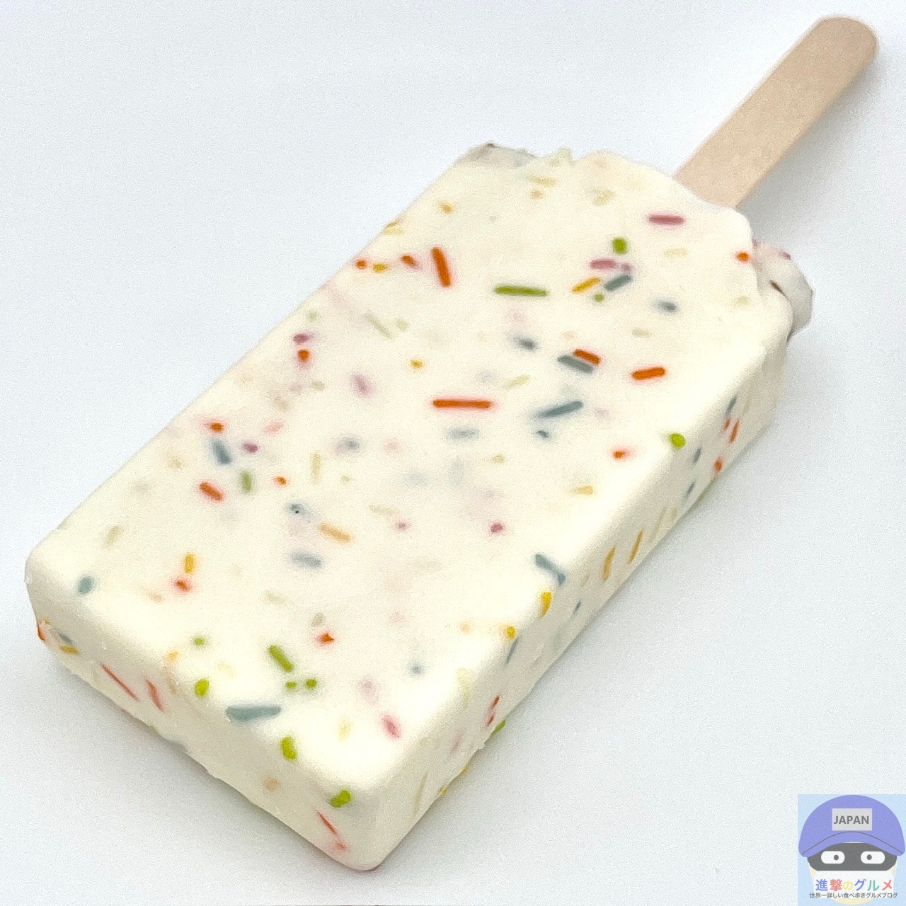 やわらかな歯触りのホイップクリーム風アイスがとろけ、たっぷり入ったカラースプレーのカリカリ食感が印象的です。