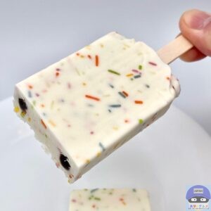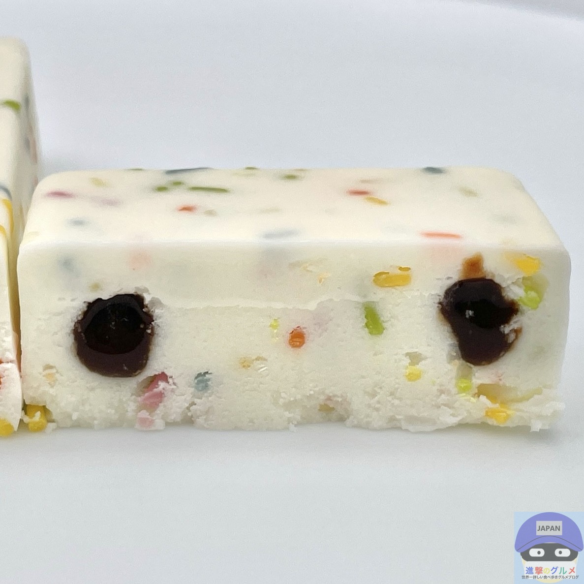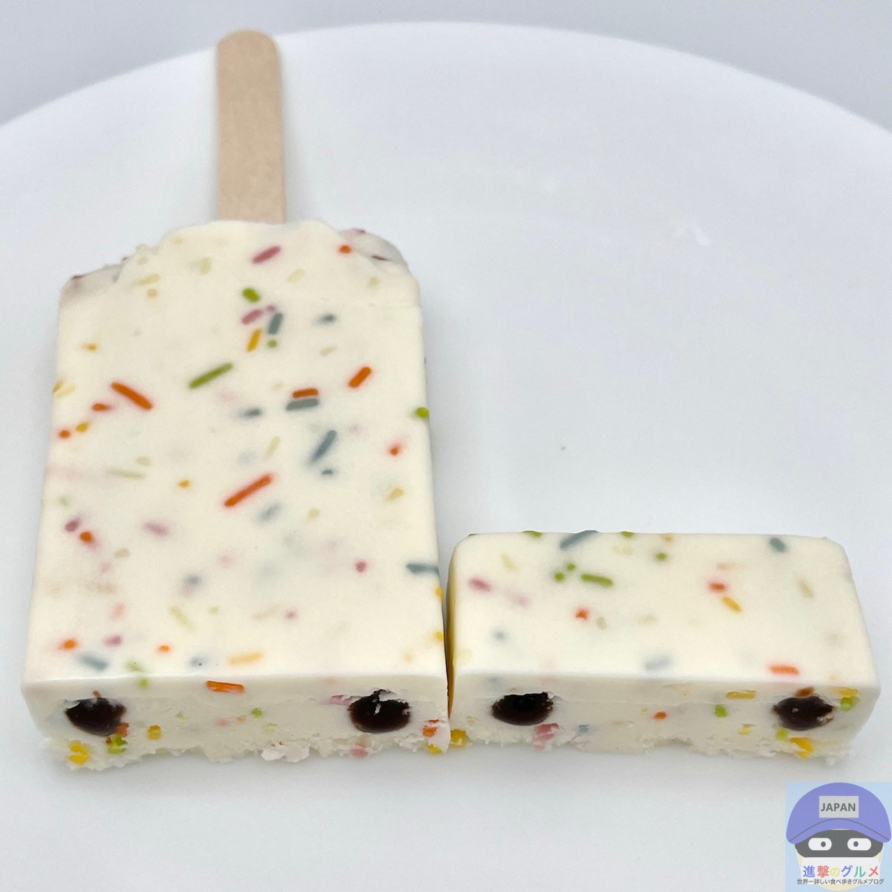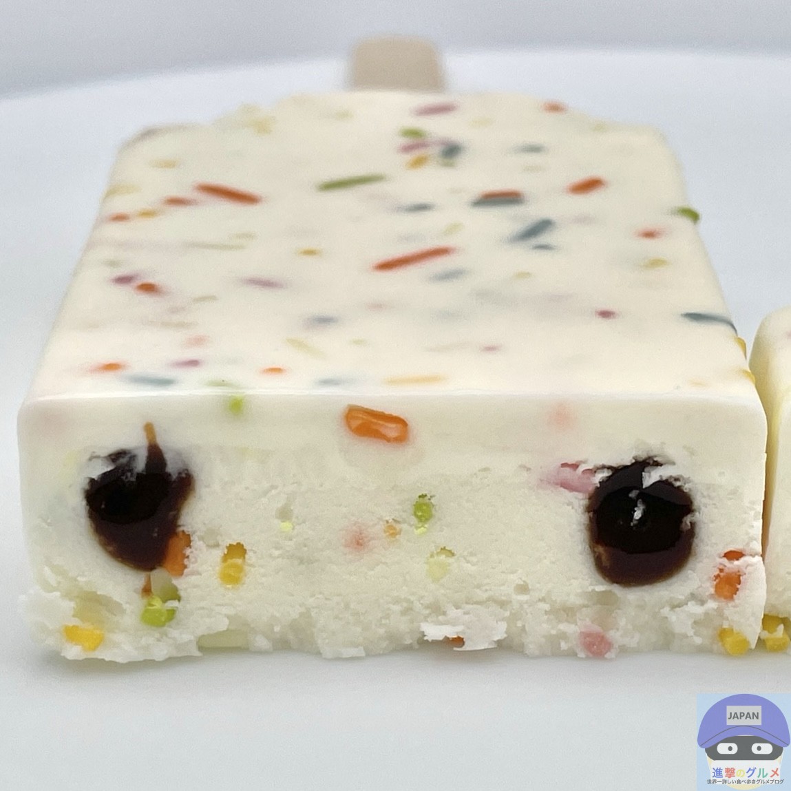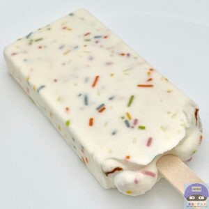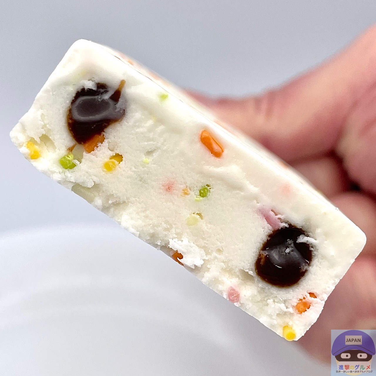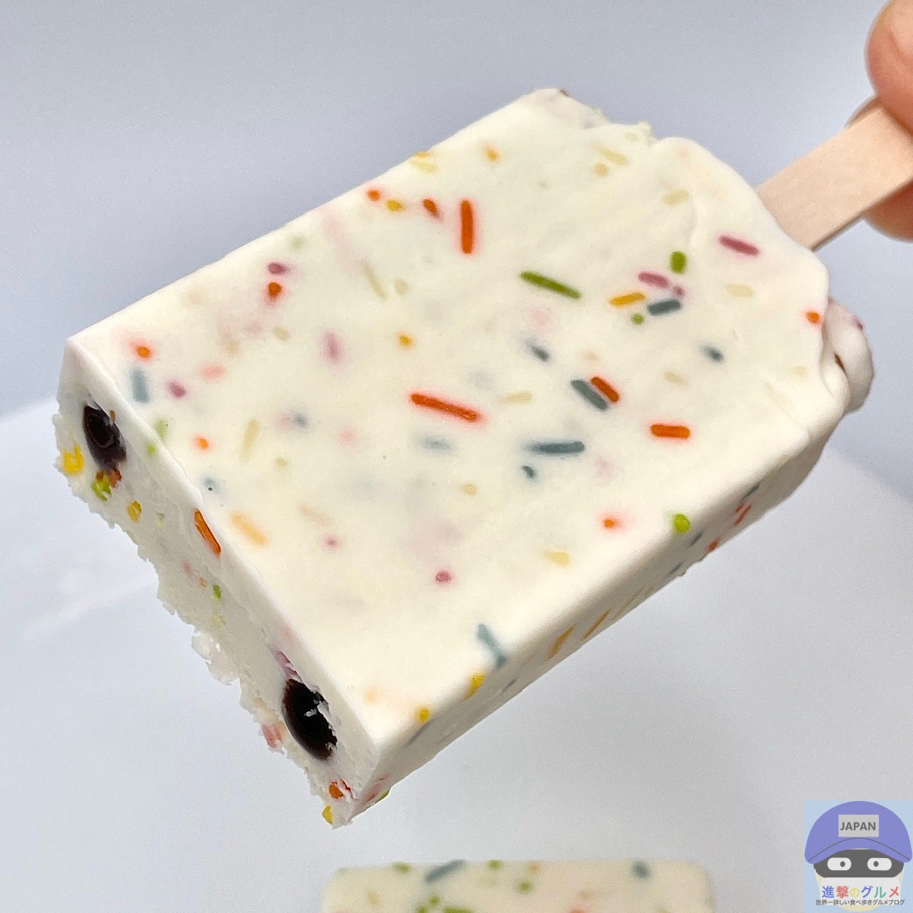 やわらかな歯触りのホイップクリーム風アイスがとろけ、たっぷり入ったカラースプレーのカリカリ食感が印象的です。