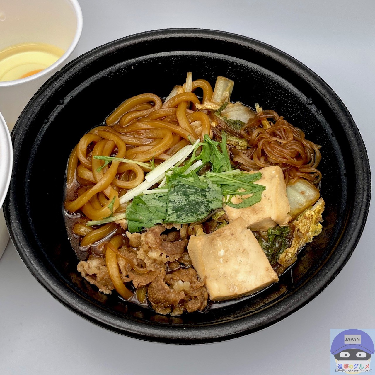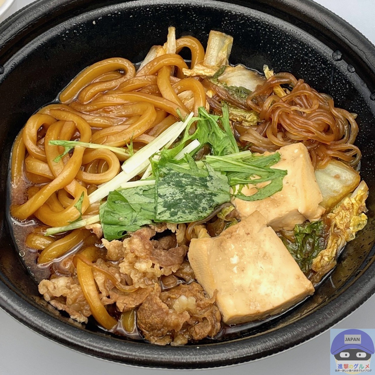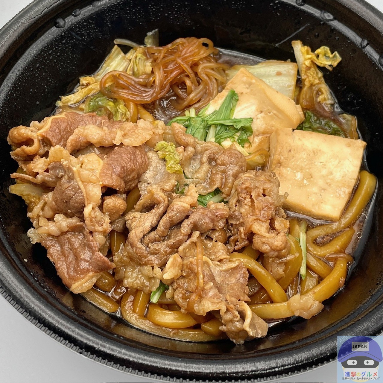 具材は、牛肉、白菜、しらたき、豆腐、うどんなどが入っています。