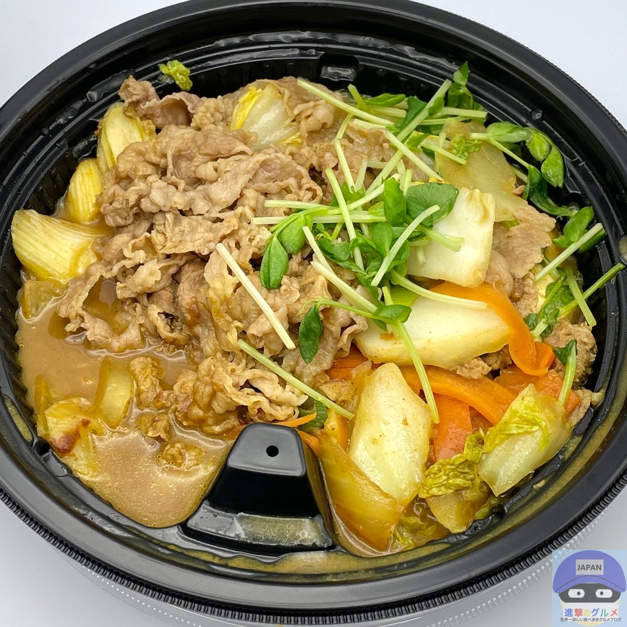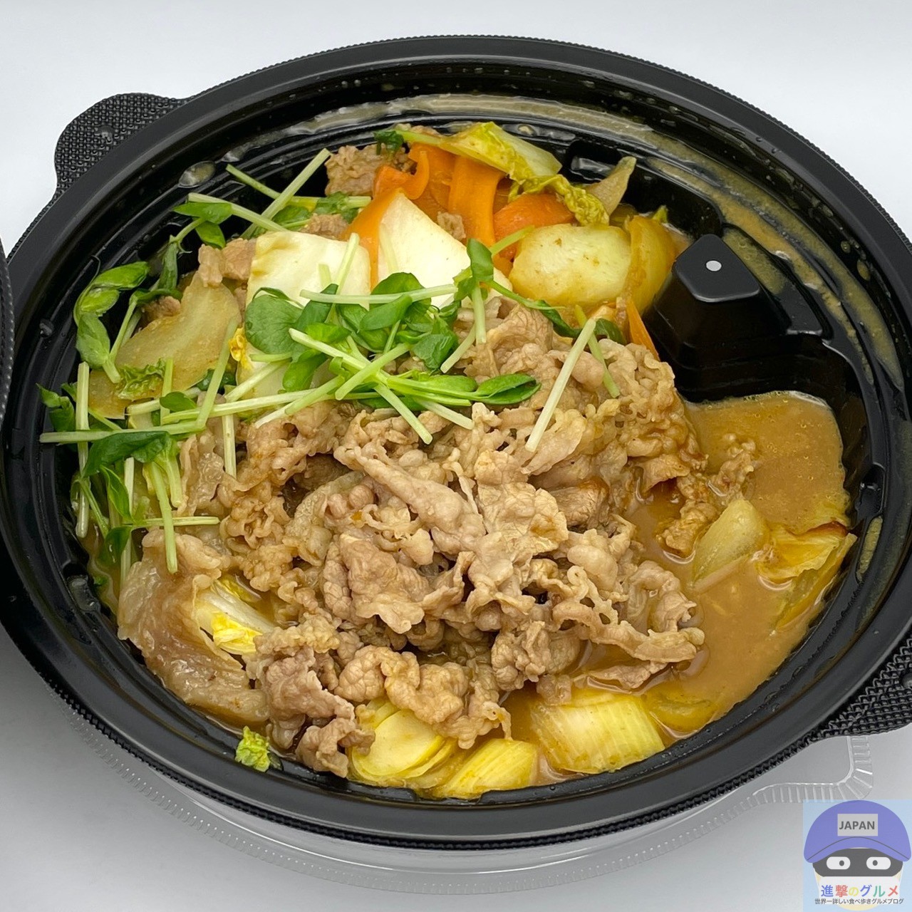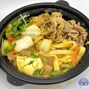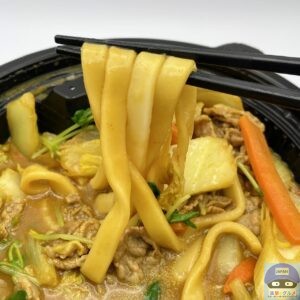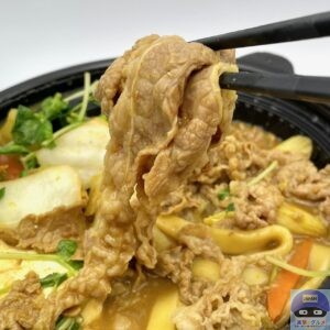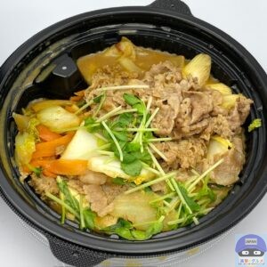 牛肉・白菜・玉ねぎ・ねぎ・豆苗・にんじん・絹豆腐・きしめんなどを少なめのカレーソースで煮込んでいます。