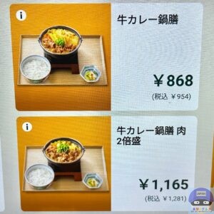 メニューは、「牛カレー鍋膳(954円)」、「牛カレー鍋・単品(844円)」があります。