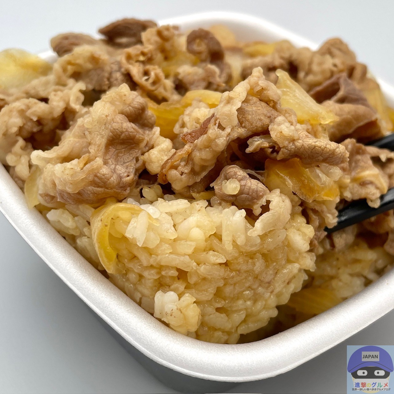 熱々のご飯を合わせて食べごたえ抜群、しんなりシャキッとした玉ねぎが良いアクセントです。