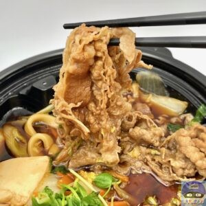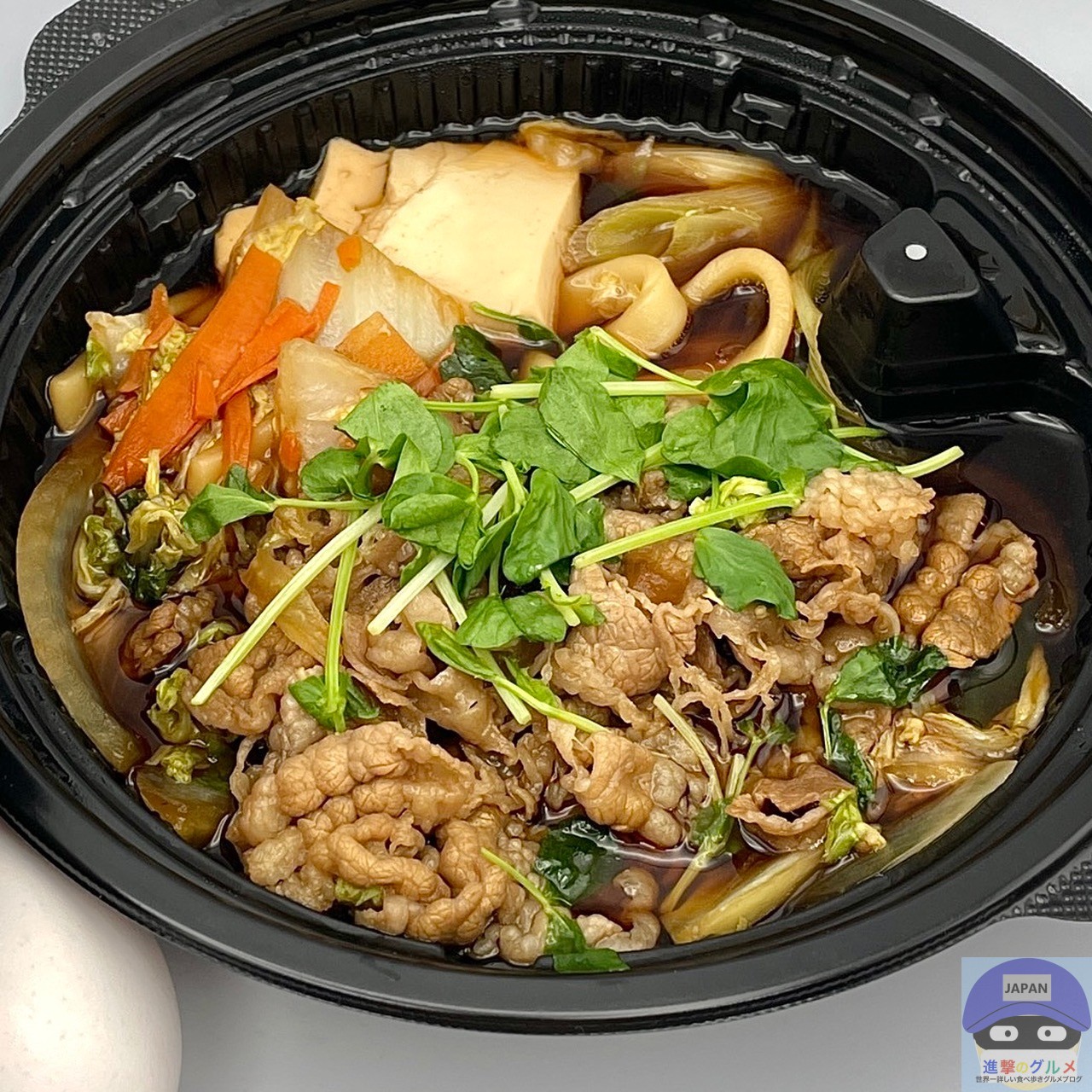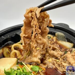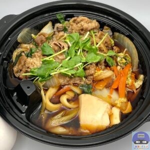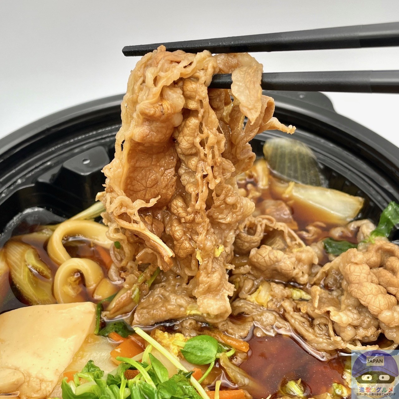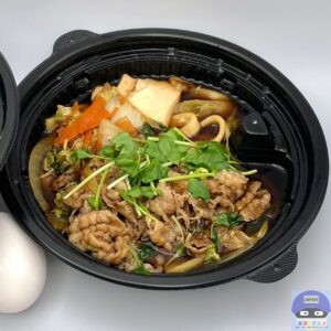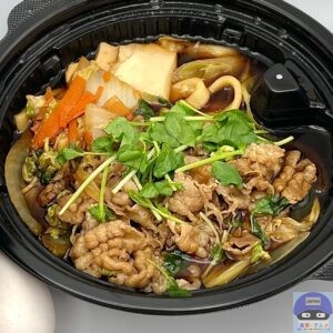 牛すきやき肉・白菜・ねぎ・豆苗・にんじん・玉ねぎ・絹豆腐・きしめんを特製すきやきのたれで煮込んでいます。