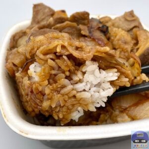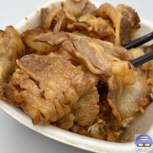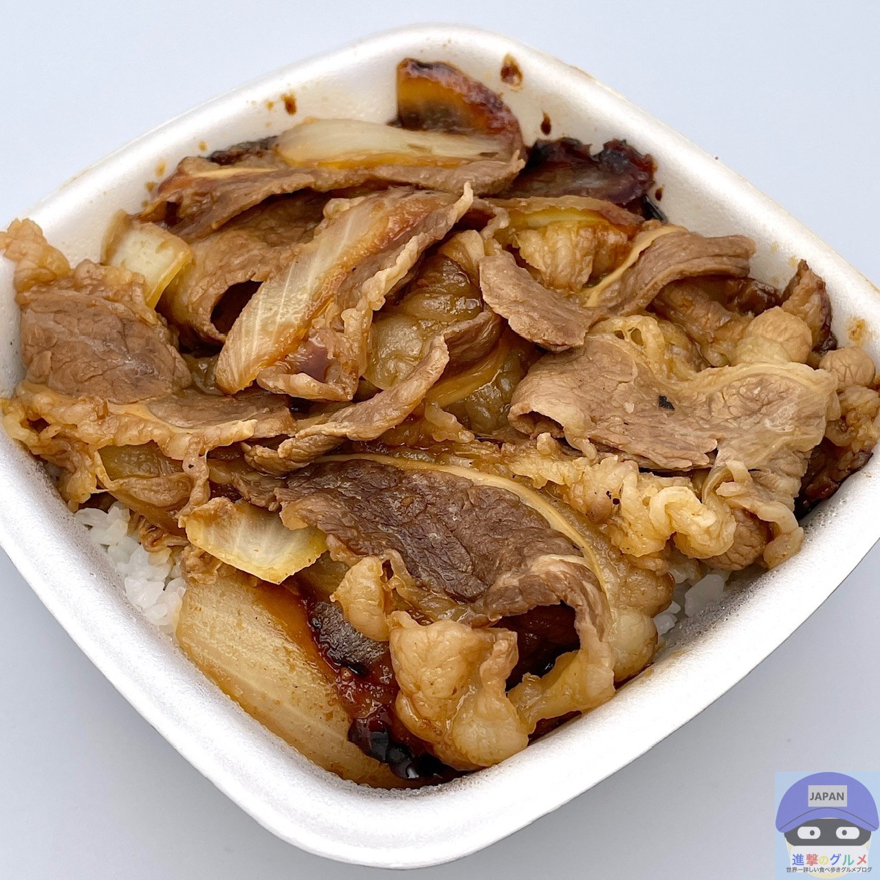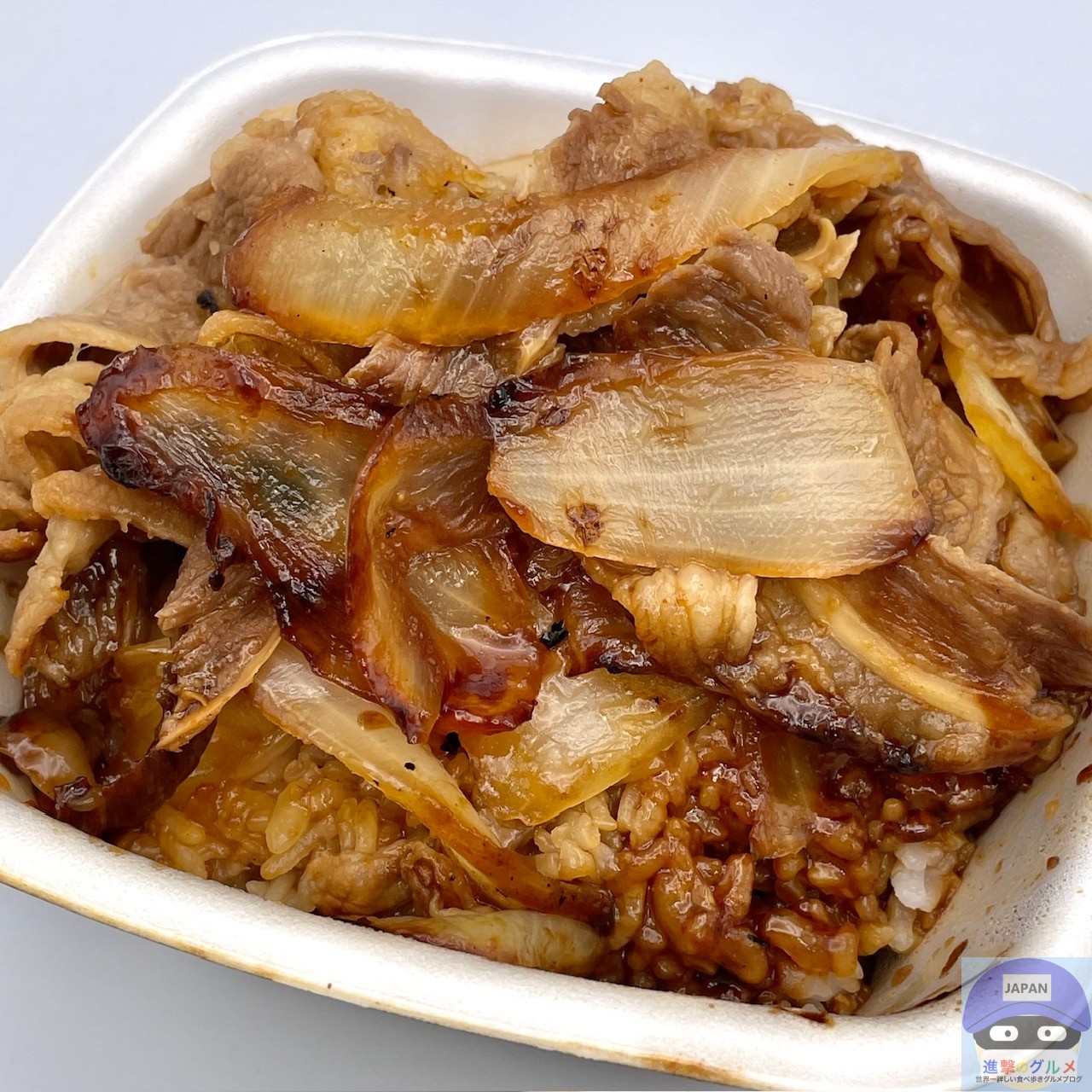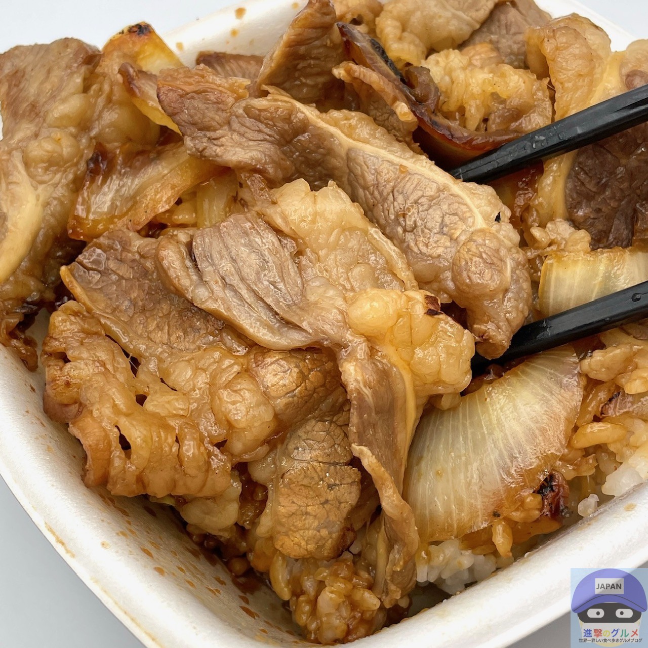 牛カルビ肉と玉ねぎを特製たれでしっかり焼き上げ、ご飯に盛りつけています。