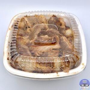 豪快に盛りつけられ、特製たれが袋の中や容器の周りにも付着しています。